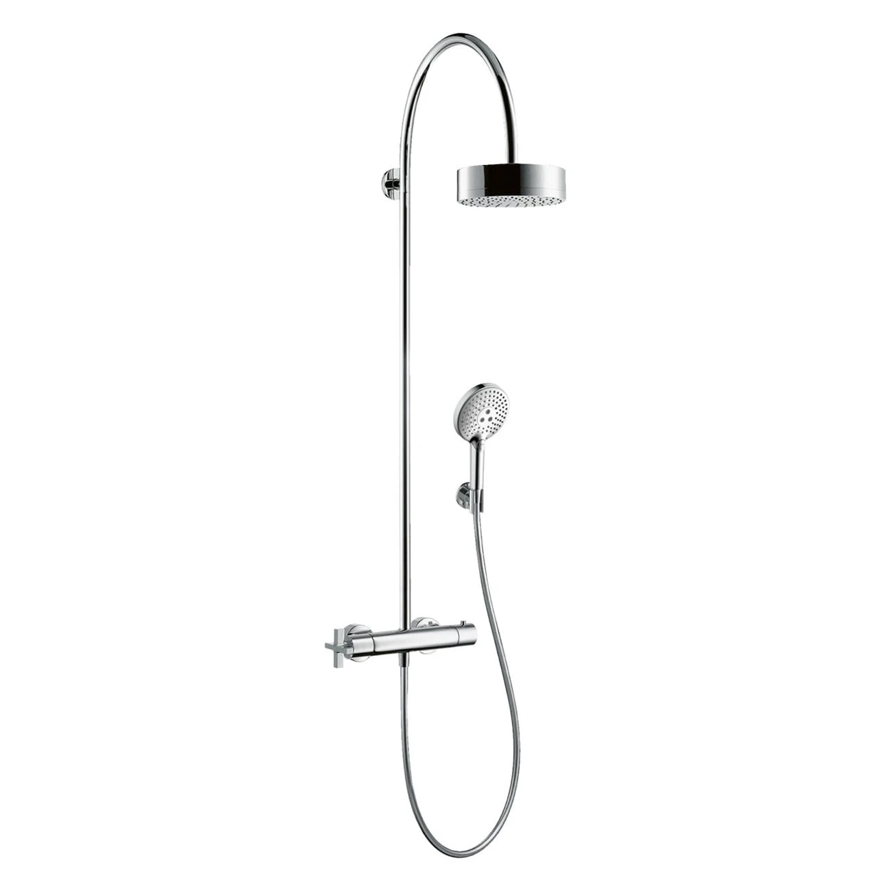 bestehend aus: Handbrause Raindance S 120 Air 3jet mit 160 cm Schlauch und Brausenhalter Kopfbrause mit Rohr Umsteller von Kopfbrause auf Handbrause Eigenschaften: eigensicher gegen Rückfließen Aufputz-Thermostat, Griff mit Ecostop Taste MTC Kartusche Schlauchanschluss DN 15 Stichmaß 15,0 +/- 1,6 cm Durchfluss Handbrause bei 0,3 MPa: 18 l/min