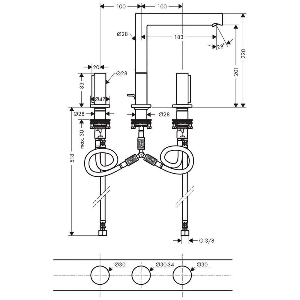 AXOR Uno 3-Loch Waschtischmischer 200 Mit Zerogriff Und Ablaufgarnitur