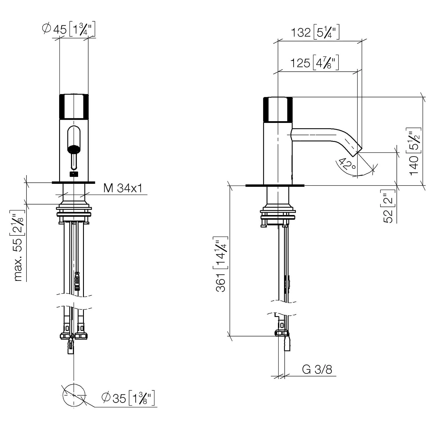 Eigenschaften;: mit elektronischer Öffnungs- und Schließfunktion ohne Ablaufganitur Infrarot-Sensorik Höhe bis Luftsprudler 5,2 cm Bohrungsdurchmesser 3,5 cm starrer Auslauf Durchfluss max. 5,7 l/min runder luftangereicherter Strahl geeignet zur thermischen Desinfektion kontinuierlicher Wasserfluss (automatische Abschaltfunktion bei Überschreitung der Nachlaufzeit) direkte Temperaturregulierung (am Produkt) anpassbarer Erfassungsbereich des Sensors Batteriebetrieb (benötigte Betterie 1x CR-P2 – nicht im Lieferumfang enthalten) 2x Druckschlauch M 8 x 1 eingeschraubt, dichtheitsgeprüft bleifrei