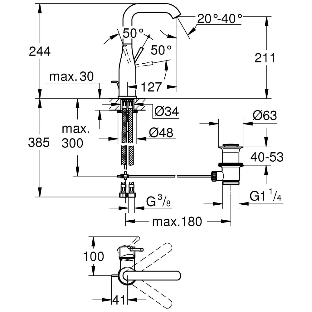 Eigenschaften: Einlochmontage GROHE SilkMove® 28 mm Keramikkartusche mit Temperaturbegrenzer GROHE EcoJoy® 5,7 l/min Mousseur GROHE AquaGuide verstellbarer Mousseur GROHE Long-Life Oberfläche schwenkbarer Auslauf mit Mousseur und Anschlagbegrenzung Zugstangen-Ablaufgarnitur (?) Zugstangen-Ablaufgarnitur Excenter-Garnitur ist der Ablauf unten im Waschbecken. 1 1/4″ flexible Anschlussschläuche GROHE QuickFix® Plus Schnellbefestigungssystem Bedienungshebel aus Metall