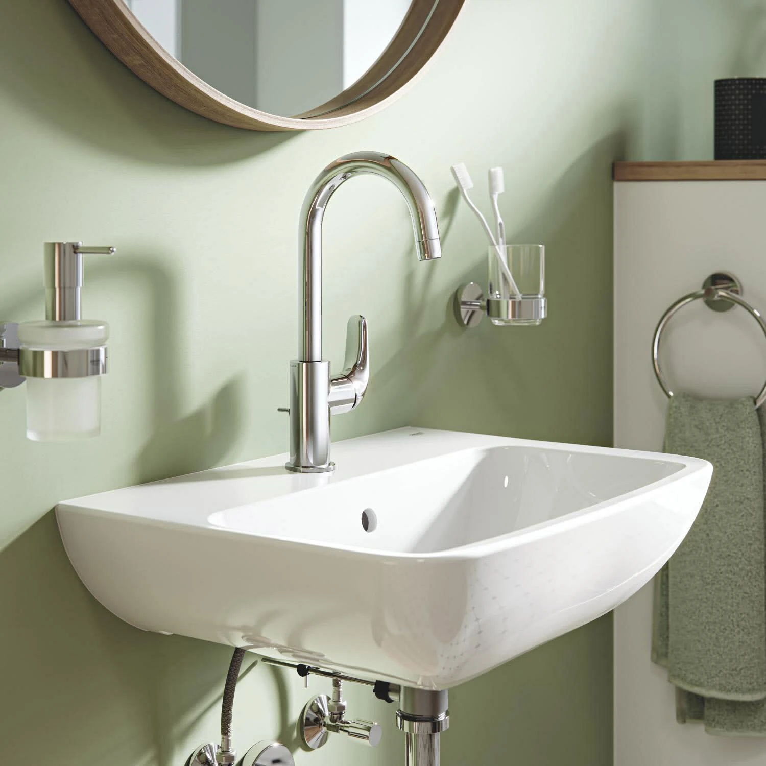 Die Neugestaltung des Badezimmers muss nicht zwangsläufig aufwendig sein– mit der neuen GROHE Swift und dem einfachen QuickFix Heimwerkerpaket geht sogar der Tausch der Badezimmer-Armatur denkbar leicht von der Hand. Gönnen Sie jetzt herausragendes Design und großartige Leistung für jeden Tag. Mit der langlebigen GROHE Long-Life Keramikkartusche im Inneren der Armatur lassen sich Wassermenge und -temperatur leichtgängig und präzise regeln. Der integrierte Temperaturbegrenzer spart Energie und die GROHE Water Saving Wasserspartechnologie begrenzt den Wasserverbrauch– ohne Abstriche bei der Leistung. Die isolierte innenliegende Wasserführung sorgt dafür, dass nur blei- und nickelfreies Wasser aus der Armatur kommt. Die Push-open-Ablaufgarnitur öffnet und schließt sich auf leichten Fingerdruck. Die integrierte Kindersicherung gewährleistet, dass der Hebel bei normaler Position nicht nach links bewegt werden kann, um die Wassertemperatur zu erhöhen– das ist zugleich ideal, um Energieverschwendung durch unnötiges Erhitzen von Wasser zu vermeiden. Zum Entriegeln der Sicherung müssen Sie lediglich den Hebel nach oben drücken. Mit der robusten, pflegeleichten GROHE Long-Life Oberfläche glänzt diese Badezimmerarmatur außerdem auch nach vielen Jahren im Gebrauch noch wie am ersten Tag. Überraschend einfach! Die Armatur ist für die Einlochmontage konzipiert und lässt sich mit GROHE QuickTool, QuickGuide und QuickVideo im Handumdrehen installieren. Eigenschaften: Einlochmontage Bedienungshebel aus Metall GROHE Long-Life 2,8 cm Keramikkartusche Energie-Sparfunktion Mittelstellung kalt mit Temperaturbegrenzer schwenkbarer Rohrauslauf flexible Anschlussschläuche GROHE QuickTool im Lieferumfang