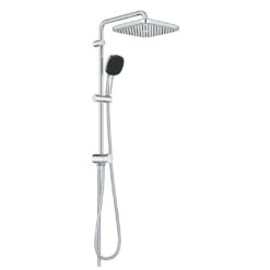 Dieses Vitalio Comfort 250 Flex Duschsystem ist die perfekte, erschwingliche Option, um Ihre Dusche in eine geräumige, komfortable und stilvolle Oase zu verwandeln. Durch die robuste und pflegeleichte GROHE Long-Life Oberfläche verliert das System nie sein strahlendes Aussehen. Ein GROHE QuickFix-Produkt für schnelle und mühelose Montage. Eigenschaften: Wandmontage Umsteller für den einfachen Wechsel zwischen Kopf- und Handbrause bzw. zwischen den beiden Strahlbildern der Kopfbrause Abstand zwischen Umstellung und oberer Konsole: 62 cm flexible Installation: Wasseranschluss über 1/2″ Gewinde des 125 cm Brauseschlauchs an Armatur / Wandabgangsbogen Kopfbrause Vitalio Comfort 250 Durchmesser: 25 cm mit Kugelgelenk, Drehwinkel ± 10° mit schwarzer Rückseite 2 Strahlarten (via Umstellung): Rain, SmartRain maximaler Durchfluss (bei 3 bar): 8,5 l/min Handbrause Vitalio Comfort 110 2 Strahlarten: Rain, Jet maximaler Durchfluss (bei 3 bar): 8,5 l/min GROHE SmartSwitch Strahlumstellung per Drehscheibe ShockProof Silikonring schützt vor Beschädigung bei Herunterfallen der Brause Inner WaterGuide Innenliegende separate Wasserführung SpeedClean Antikalk-System, einfach mit dem Finger von Kalkablagerungen befreit GROHE Water Saving weniger Wasser, perfekter Wasserfluss GROHE DreamSpray für ein perfektes Strahlbild in der Höhe verstellbar mittels Gleitelement Brauseschlauch VitalioFlex Trend 1x 150 cm und 1x 125 cm knickfest Universalanschluss 1/2″ x 1/2″ Hitzebeständig bis 70°C Druckbeständigkeit bis 5 bar glatte, reinigungsfreundliche Oberfläche Brausestange mit Brausearm: 39 cm Gleitelement zum Einstellen der Handbrause