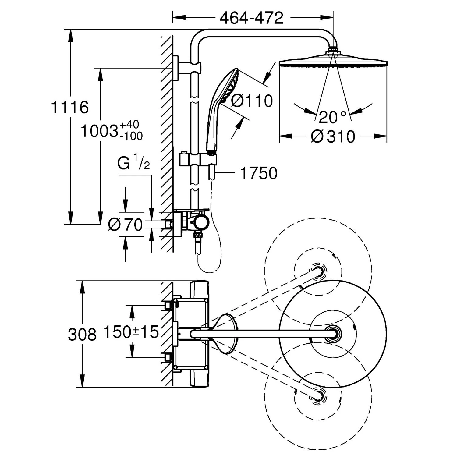 bestehend aus: horizontal schwenkbarer 450 mm Duscharm Aufputz-Thermostat Precision Joy mit Aquadimmer Funktion ermöglicht den Wechsel zwischen: Vitalio Rain 310 Mono Kopfbrause Strahlart: Brausestrahl Rain mit Kugelgelenk Drehwinkel ± 15° Handbrause Vitalio Joy 110 Massage (27 319 000) 3 Strahlarten: Rain / Massage / SmartRain in der Höhe verstellbar mittels Gleitelement Brauseschlauch VitalioFlex Silver 1750 mm, ½“ x ½“ (27 506 000) GROHE EasyReach Ablage (26 362 LN0) GROHE EcoJoy 9,5 l/min Durchflusskonstanthalter GROHE TurboStat Kompaktkartusche mit Dehnstoff-Thermoelement GROHE SafeStop Sicherheitssperre bei 38°C GROHE SafeStop Plus optional einsetzbarer Temperaturendanschlag bei 43°C GROHE CoolTouch kein Verbrennen an heißen Oberflächen GROHE MetalGrip ergonomischer Metallgriff GROHE DreamSpray perfektes Strahlbild GROHE StarLight Oberfläche GROHE SprayDimmer (stufenlose Reduktion der Durchflussmenge) innenliegende separate Wasserführung SpeedClean Antikalk-System Twistfree gegen Verdrehen des Brauseschlauchs für Durchlauferhitzer ab 18 kW/h geeignet Mindestdurchfluss 7 l/min GROHE QuickFix: Schnelle und mühelose Montage