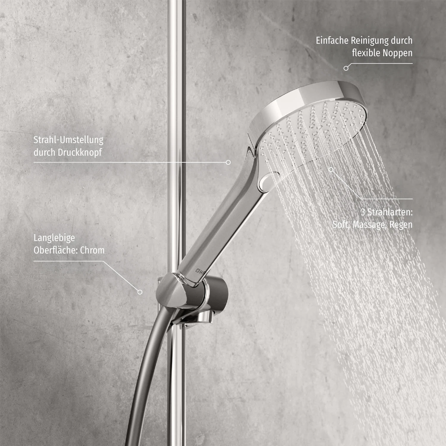 Eigenschaften: mit Anti-Kalk-Technologie: für einfache Reinigung und hohe Lebensdauer 3 Strahlarten: Normal-, Massage- u. Regenstrahl Normalstrahl: gleichmäßiger, weicher Wasserstrahl Massage-Strahl: starker Wasserstrahl durch drehbare Sprühdüsen Regenstrahl: gleichmäßiger und starker Wasserstrahl Arbeitsdruck: 50 – 500 kPa Warmwasser: max. +65°C EN Standard: EN1112 Geräuschklasse: I (ISO 3822) Anschlussgröße: G1/2