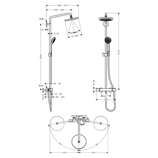 Eigenschaften: Besteht aus: Kopfbrause, Handbrause, Einhebel-Brausemischer, Brauseschlauch, Schieber Kopfbrause Croma 220 Brausekopfgröße: 220 mm Kopfbrause im Winkel verstellbar Strahlart: RainAir Durchflussmenge RainAir Strahl (bei 3 bar): 16 l/min Betriebsdruck: min. 1,5 bar/max. 10 bar vollverchromte Strahlscheibe Brausearmlänge: 400 mm schwenkbarer Brausearm höhenverstellbare Handbrausehalterung Montageart: Aufputzinstallation Anschlussgröße DN15 Anschlussgewinde R ½ Stichmaß 150 ± 12 mm Keramikmischsystem Temperaturbegrenzung einstellbar Lieferumfang: Showerpipe mit Einhebelmischer, Rosetten, S-Anschlüsse, Befestigungsmaterial, Montageanleitung Bestehend aus: Kopfbrause 220 1jet (# 26464000) Handbrause Vario (# 28535000) Brauseschlauch 160 cm (# 28276000)