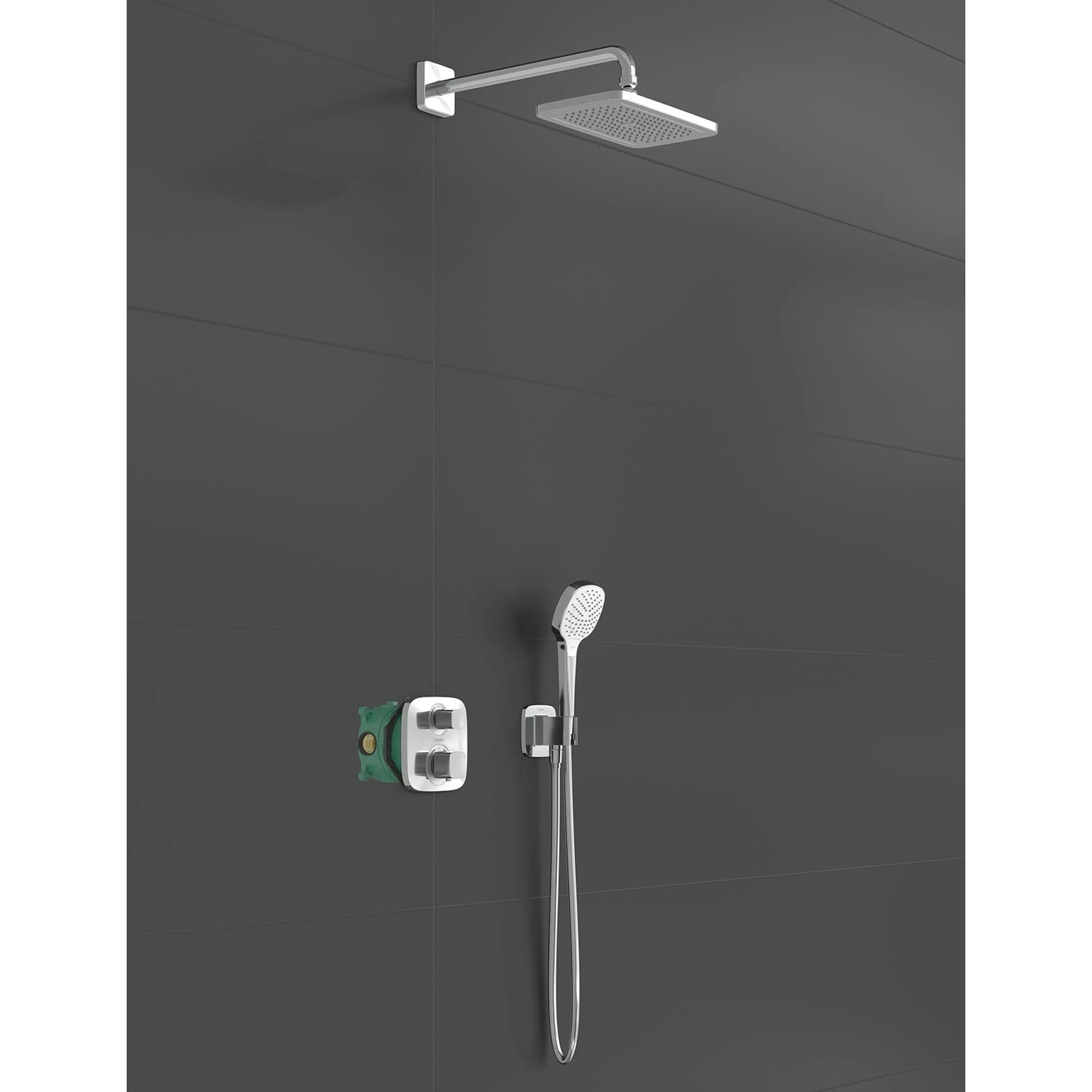 Eigenschaften: 6 in 1: alles aus einer Hand – die Designkompetenz von hansgrohe bietet die Basis für moderne Badgestaltung Lieferumfang: Brausesystem, Befestigungsmaterial, Montageanleitung Sanfte Regendusche: die Strahlart RainAir umhüllt den Körper mit samtweichen Wassertropfen Mehr Abwechslung: Der Duschkopf verwöhnt mit der Strahlart RainAir, die Handbrause mit den Strahlarten Rain, IntenseRain und TurboRain Komfortabel umschalten: auf Knopfdruck schnell und einfach die gewünschte Strahlart auswählen (Select) Mehr Komfort: das Thermostat hält die eingestellte Wunschtemperatur und schützt zuverlässig vor zu heißem oder zu kaltem Wasser Mehr Platz in der Dusche: Grundset ibox universal für eine Unterputz-Installation im Lieferumfang enthalten Länger wie neu: Kalk lässt sich einfach von den Silikondüsen am Duschkopf abwischen (QuickClean) Großartiges Wasservergnügen: die Kopfbrause liefert ca. 18 l/min, die Handbrause bis zu 14,7 l/min (je bei 3 bar) Komfort auf ganzer Länge: mit 1,25 m langem Duschschlauch für große Bewegungsfreiheit. Eine spezielle Befestigung verhindert lästiges Verdrehen Griffbereit: Mit dem praktischen Brausehalter ist der Duschkopf stets aufgeräumt und bequem erreichbar In allen Bestandteilen sind Premium-Materialien verbaut – für mehr Sicherheit und Nachhaltigkeit im Haushalt hansgrohe seit 1901 – die Premium-Marke für zuverlässige Bad- und Küchenprodukte 5 Jahre freiwillige Herstellergarantie auf ein Produkt, das nach höchsten Qualitätsstandards gefertigt wurde