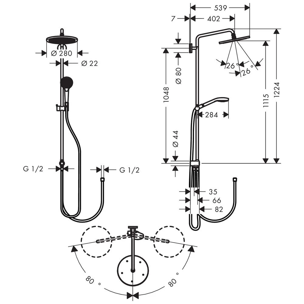 Eigenschaften: Besteht aus: Kopfbrause, Handbrause, Brauseschlauch, Schieber Kopfbrause Croma 280 Brausekopfgröße: 280 mm Kopfbrause im Winkel verstellbar Strahlart: RainAir Durchflussmenge RainAir Strahl (bei 3 bar): 10 l/min vollverchromte Strahlscheibe schwenkbarer Brausearm Brausearmlänge: 400 mm höhenverstellbare Handbrausehalterung Verbraucher: Kopfbrause, Handbrause Wasseranschluß: Isiflex Brauseschlauch 0,80 m Montageart: Aufputzinstallation Anschlussgewinde G ½ Anschlussgröße: DN15 Lieferumfang: Showerpipe Reno, Rosette, Befestigungsmaterial, Montageanleitung Bestehend aus: Brauseschlauch 160 cm (# 28276000) Brauseschlauch B 80 cm (# 28278000) Kopfbrause 280 1jet (# 26220000) Handbrause Multi (# 26800400)