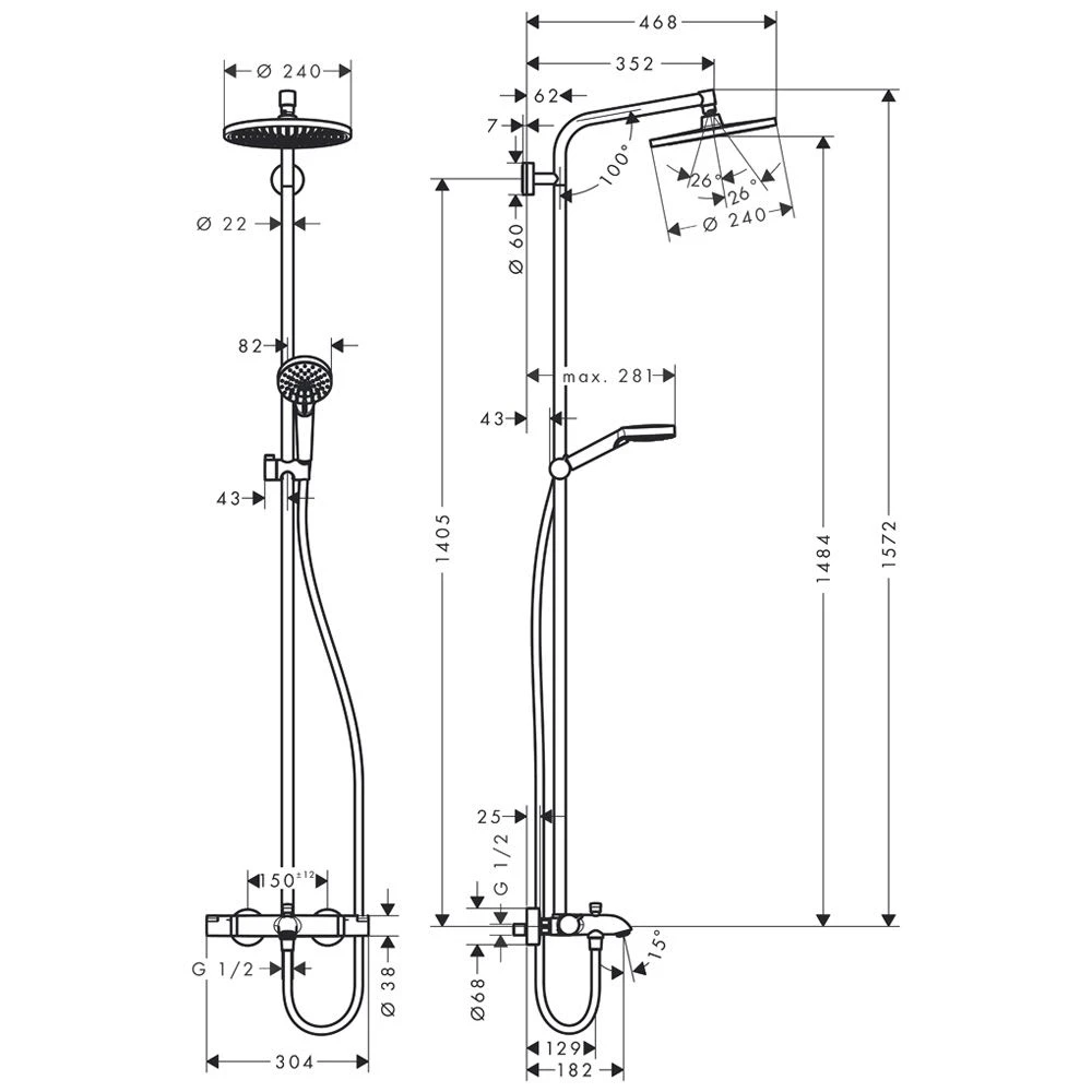 Eigenschaften: Besteht aus: Kopfbrause, Handbrause, Wannenthermostat, Brauseschlauch, Schieber um 45° verstellbarer Neigungswinkel des Schiebers Kopfbrause Crometta S 240 Brausekopfgröße: 240 mm Kopfbrause im Winkel verstellbar Strahlart: Rain Durchflussmenge Rain Strahl (bei 3 bar): 17 l/min Betriebsdruck: min. 1,5 bar/max. 10 bar vollverchromte Strahlscheibe Brausearmlänge: 350 mm Thermostat Ecostat Comfort Durchflussmenge Wanneneinlauf: 20 l/min Sicherheitssperre bei 40° C einstellbare Heißwasserbegrenzung Verbraucheransteuerung durch Drehen Montageart: Aufputzinstallation Anschlussgröße DN15 Anschlussgewinde R ½ Stichmaß 150 ± 12 mm höhenverstellbare Handbrausehalterung Lieferumfang: Showerpipe mit Wannenthermostat, Rosetten, S-Anschlüsse, Befestigungsmaterial, Montageanleitung Bestehend aus: Isiflex Brauseschlauch 160 cm (28276XXX) Crometta S 240 1jet Kopfbrause (26723000) Crometta Vario Handbrause (263304000)