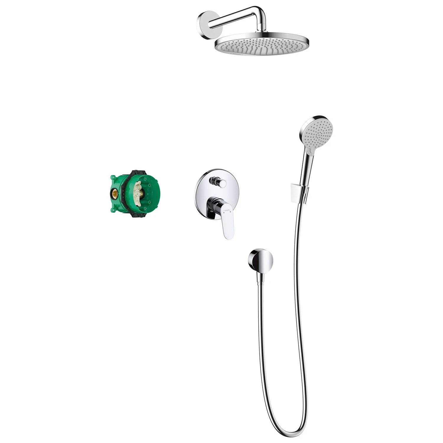 Eigenschaften: 7 in 1: alles aus einer Hand – die Designkompetenz von hansgrohe bietet die Basis für moderne Badgestaltung Lieferumfang: Brausesystem, Befestigungsmaterial, Montageanleitung Regendusche: Die Strahlart Rain verwöhnt Tag für Tag Mehr Abwechslung: Der Duschkopf verwöhnt mit der Strahlart Rain, die Handbrause mit den Strahlarten Rain und IntenseRain Schnelle Strahlumstellung: direkt am Duschkopf durch Drehen der Strahlscheibe Einfach zu bedienen: Über den eleganten Griff des Einhebelmischers werden Temperatur und Wassermenge leichtgängig eingestellt Mehr Platz in der Dusche: Grundset ibox universal für eine Unterputz-Installation im Lieferumfang enthalten Länger wie neu: Kalk lässt sich einfach von den Silikondüsen am Duschkopf abwischen (QuickClean) Großartiges Wasservergnügen: die Kopfbrause liefert ca. 18 l/min, die Handbrause bis zu 14 l/min (je bei 3 bar) Komfort auf ganzer Länge: mit 1,25 m langem Duschschlauch für große Bewegungsfreiheit. Eine spezielle Befestigung verhindert lästiges Verdrehen Griffbereit: Mit dem praktischen Brausehalter ist der Duschkopf stets aufgeräumt und bequem erreichbar In allen Bestandteilen sind Premium-Materialien verbaut – für mehr Sicherheit und Nachhaltigkeit im Haushalt hansgrohe seit 1901 – die Premium-Marke für zuverlässige Bad- und Küchenprodukte 5 Jahre freiwillige Herstellergarantie auf ein Produkt, das nach höchsten Qualitätsstandards gefertigt wurde