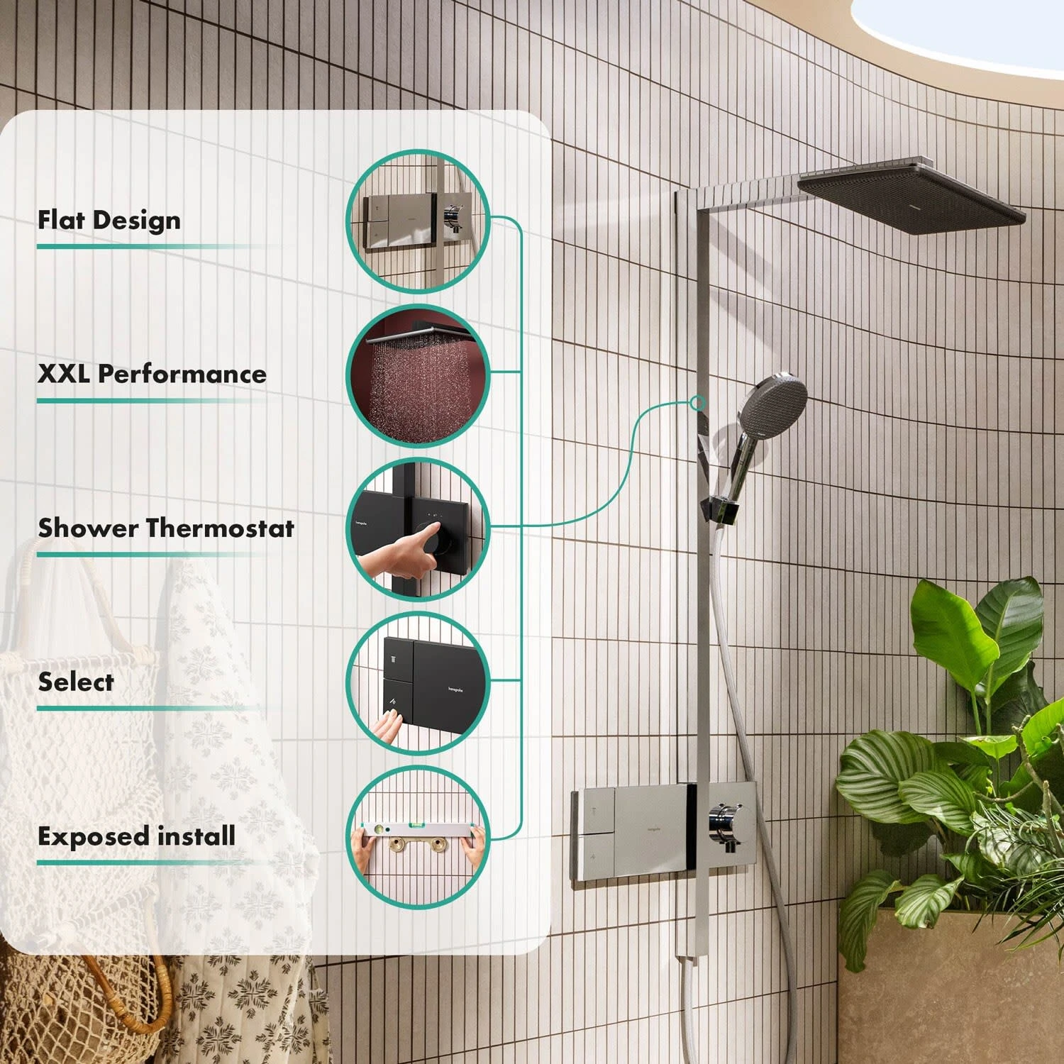 Begeisterung – neu komponiert. Raindance Alive Q 210/340 Duschsystem mit Thermostat (1 Strahlart) Ankommen und aufatmen! Mit hansgrohe Raindance Alive Q 210/340 (1 Strahlart) haben Sie gefunden, was Sie suchen. Ein harmonisch aufeinander abgestimmtes Duschsystem für mehr Geborgenheit, Entspannung und Erfrischung. Ein erster Blick enthüllt das Besondere. Inspiriert von einer Symbiose aus Wasser, Mensch und Raum zelebriert Raindance Alive das Lebenselixier. Und es schenkt Ihnen etwas, das noch kostbarer als Wasser ist: Zeit für sich selbst. Vertrauter Name. Vollkommen neues Gefühl Belebende Erfahrung: hansgrohe Raindance Alive bietet extra großes Duschvergnügen voller Wohlbehagen und Komfort Meisterliches Design: ikonisch und zeitlos überdauert es kurzlebige Trends. Entworfen in Zusammenarbeit mit dem renommierten Studio Phoenix Wohlfühlatmosphäre: Die moderne Gestaltung des Duschkopfs strahlt Wärme aus und macht das Badezimmer wohnlicher Große Auswahl: Je nach Stimmung wählen Sie mit einem Tastendruck (Select) zwischen drei Strahlarten an der Handbrause. Die Kopfbrause verwöhnt mit der Strahlart RainAir – je nach Vorliebe können Sie alternativ auch hansgrohe PowderRain voreinstellen Weitere Besonderheiten Unbeschwert duschen: Das Thermostat hält Ihre Wunschtemperatur gleichmäßig ein und schützt vor zu heißem Wasser Auch für kalkhaltiges Wasser geeignet: Die eloxierte Abdeckung lässt sich leicht abnehmen und reinigen. Darunter verborgene, flexible Düsen werden durch Abwischen von Rückständen befreit Skulpturales Design – einfach eingebaut: Ihr hansgrohe Duschsystem wird von außen montiert (Aufputz). Die Wand bleibt unversehrt Markenqualität: 5 Jahre freiwillige Herstellergarantie und ausgesuchte Materialien bewahren das Besondere für lange Zeit Eigenschaften: Duschvergnügen: Extra großer Duschkopf (21 x 34 cm), der den ganzen Körper in wohlig warmes Wasser einhüllt Wohlfühlatmosphäre: Die Mesh-Abdeckung strahlt Wärme aus und macht das Badezimmer wohnlicher Zeitlos schön: Matt Black und eine Strahlscheibe in Graphit schaffen ein faszinierendes Design Wahlmöglichkeit: Verwöhnt ab Werk mit RainAir. Ein Wechsel zu hansgrohe PowderRain ist jederzeit möglich hansgrohe Regendusche: Die Strahlart RainAir umhüllt den Körper mit samtweichen Wassertropfen Wasser an – Alltag aus: Die Thermostatfunktion verwöhnt mit einer gleichmäßigen Wassertemperatur Einfach eingebaut: Mitgelieferte S-Anschlüsse werden auf den Wasserauslass geschraubt – die Wand bleibt unversehrt Mehr Komfort auf Knopfdruck: Mit der Select-Taste von hansgrohe lässt sich das Wasser schnell an- und abstellen Auf Wunsch Wasser sparen: Die Wassermenge lässt sich individuell einstellen (Water Flow Control) Die Lösung gegen Kalk: Flexible Silikondüsen unter der Abdeckung lassen sich leicht abwischen (QuickClean) Erstmals in einer Handbrause: die beiden hansgrohe Strahlarten RainAir und PowderRain. Ergänzt von einem Massagestrahl 5 Jahre freiwillige Herstellergarantie auf ein Produkt, das nach höchsten Qualitätsstandards gefertigt wurde In allen Bestandteilen sind Premium-Materialien verbaut – für mehr Sicherheit und Nachhaltigkeit im Haushalt hansgrohe seit 1901 – die Premium-Marke für zuverlässige Bad- und Küchenprodukte Lieferumfang: Rosetten S-Anschlüsse Showerpipe mit Thermostat Befestigungsmaterial Montageanleitung