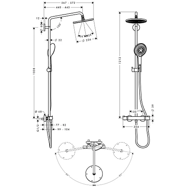 Eigenschaften: Besteht aus: Kopfbrause, Handbrause, Brausethermostat, Brauseschlauch, Schieber Kopfbrause Raindance S 240 Air Brausekopfgröße: 240 mm Kopfbrause im Winkel verstellbar Strahlart: RainAir Durchflussmenge RainAir Strahl (bei 3 bar): 9,5 l/min Betriebsdruck: min. 1,5 bar/max. 10 bar Brausearmlänge: 430 mm schwenkbarer Brausearm Thermostat Ecostat Comfort Sicherheitssperre bei 40° C einstellbare Heißwasserbegrenzung Verbraucheransteuerung durch Drehen Montageart: Aufputzinstallation Anschlussgröße DN15 Anschlussgewinde R ½ Stichmaß 150 ± 12 mm höhenverstellbare Handbrausehalterung für Durchlauferhitzer mit einer Leistung von 18 kW geeignet Lieferumfang: Showerpipe mit Thermostat, Rosetten, S-Anschlüsse, Befestigungsmaterial, Montageanleitung Bestehend aus: Brauseschlauch 160 cm (# 28276000) Handbrause 120 3jet EcoSmart 9 l/min (# 26531000)
