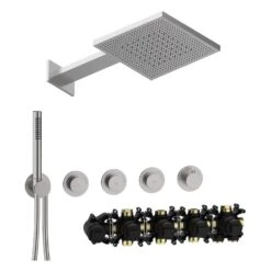 Mit MODUL7 präsentiert Herzbach ein neues und einzigartiges System für hochwertige Badwelten, das sich durch das einheitliche 7 cm Blenden-Design und eine optimale Anpassungsfähigkeit auszeichnen. Das Unterputz-System hat dabei serienmäßig alle abstandsgebenden Elemente mit einem Stichmaß von 10,5 cm bereits integriert. Dadurch gestaltet sich der Einbau nicht nur einfach und mühelos, der Abstand ist auch stets perfekt. Das Ergebnis ist nicht nur funktional, sondern begeistert mit seiner perfekten und zeitlosen Eleganz. Modul7 ist mit der Herzbach Artikelwelt kombinierbar und macht ihr Traumbad möglich. Set bestehend aus: MODUL7 PUSH Thermostat-Einbaukörper für 3 Verbraucher, Art.-Nr. 70.730003.1.09: 1/2″ Anschlussbogen LOGIC-Thermostatkartusche schallentkoppelte Montage Dichtmanschette geeignet für Abdichtung nach DIN 18534 2 Zuläufe unten verwechslungssicher markiert Anschlussgewinde G 3/4″ Einbautiefe 7,7 cm – 9,7 cm MODUL7 PUSH Thermostat-Farbset für 3 Verbraucher, Art.-Nr. 70.703003.1.09: drehbare Thermostatkartusche zur Regelung des Temperaturbereichs von 20° C – 55° C manuell entriegelbare Heißwassersperre bei 38° C als Verbrühschutz Modulblende mit skizzierter Temperaturskala 3 PUSH Mengenventile Start + Stop des Wasserflusses durch Drücken des PUSH Mengenventils leichtgängige und stufenlose Mengenregulierung mit komfortablem 90° Bedienradius Wandanschlussbogen mit Brausehalter und verdecktem Schlauchanschluss Brauseschlauch 150 cm mit Drehkonus Stabhandbrause, 1-strahlig LIVING SPA Regenbrause TWIN FLOW, Art.-Nr. 11.044277.1.09: 30 x 30 cm Strahlart: Regen soft, Regen intensiv mit Befestigungsmaterial zur Aufputz-Wandmontage Clean-Effect Eigenschaften: Montageart: Wandmontage Unterputz Material: Edelstahl Oberfläche: Edelstahl matt gebürstet Mittenabstand Modulblenden 10,5 cm min. Betriebsdruck: 0,5 bar max. Betriebsdruck: 5 bar integrierte Rückflussverhinderer und Schmutzfangsiebe