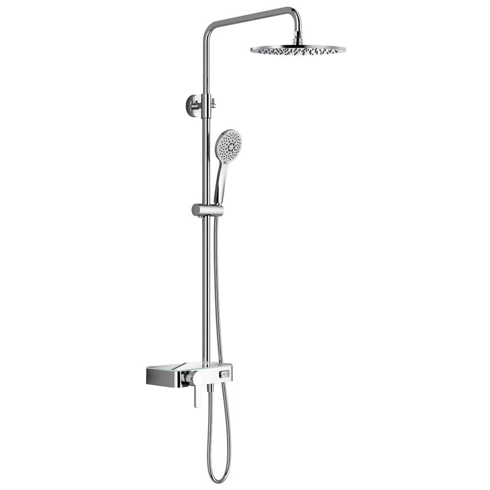 bestehend aus: Einhand-Einhebelmischer rund, mit integriertem Funktionsumsteller Ablage aus Einscheiben-Sicherheitsglas (ESG) Kopfbrause rund flach Ø 40 cm, Höhe 8 mm, schwenkbar Höhe der regenbrause individuell justierbar Antikalk-Noppen Design-Handbrause rund mit 5 Strahlarten: Rain, SoftRain, Massage, Rain & Massage, SoftMassage Brauseschlauch 150 cm, silber mit beidseitiger Verdrehsicherung Eigenschaften: höhenverstellbare Halterung an der Brausestange Höhe: 84,5 – 134,5 cm Ausladung 44,5 cm inkl. Montagezubehör