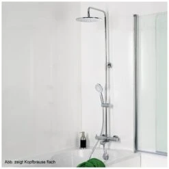 Eigenschaften: Kopfbrause superflach ( 0,2 cm hoch ), rund Ø 30 cm mit Sicherheits-Badewannen-Thermostatarmatur, rund, mit 38° C Sperre integrierter Funktionsumsteller Höhe der Regenbrause individuell justierbar Anti Kalk Funktion separate Design-Handbrause mit 3 Strahlarten: Rain, SoftRain, Massage höhenverstellbare Halterung an der Brausestange inkl. Montagezubehör
