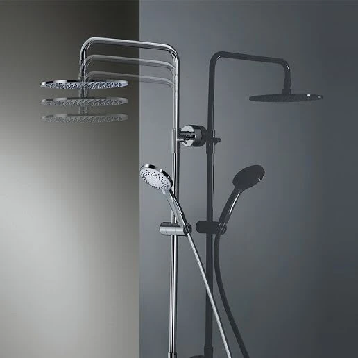 Eigenschaften: Kopfbrause flach ( 0,8 cm hoch ), rund Ø 40 cm Kopfbrause schwenkbar mit Sicherheitsthermostatarmatur mit 38° C Sperre mit integriertem Funktionsumsteller Höhe der Regenbrause individuell justierbar Anti Kalk Funktion separate Design Handbrause rund, mit 2 Strahlarten: Normalstrahl und Massagestrahl höhenverstellbare Halterung an der Brausestange inkl. Montagezubehör