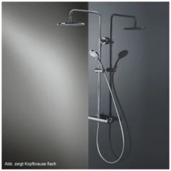 Eigenschaften: Kopfbrause superflach ( 0,2 cm hoch ), rund Ø 25 cm Kopfbrause schwenkbar mit Sicherheitsthermostatarmatur mit 38° C Sperre mit integriertem Funktionsumsteller Höhe der Regenbrause individuell justierbar Anti Kalk Funktion separate Design Handbrause rund, mit 2 Strahlarten: Normalstrahl und Massagestrahl höhenverstellbare Halterung an der Brausestange inkl. Montagezubehör