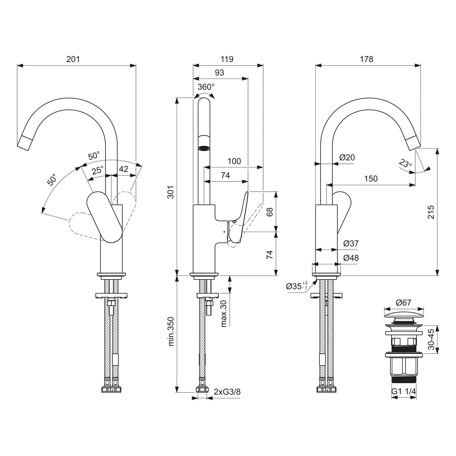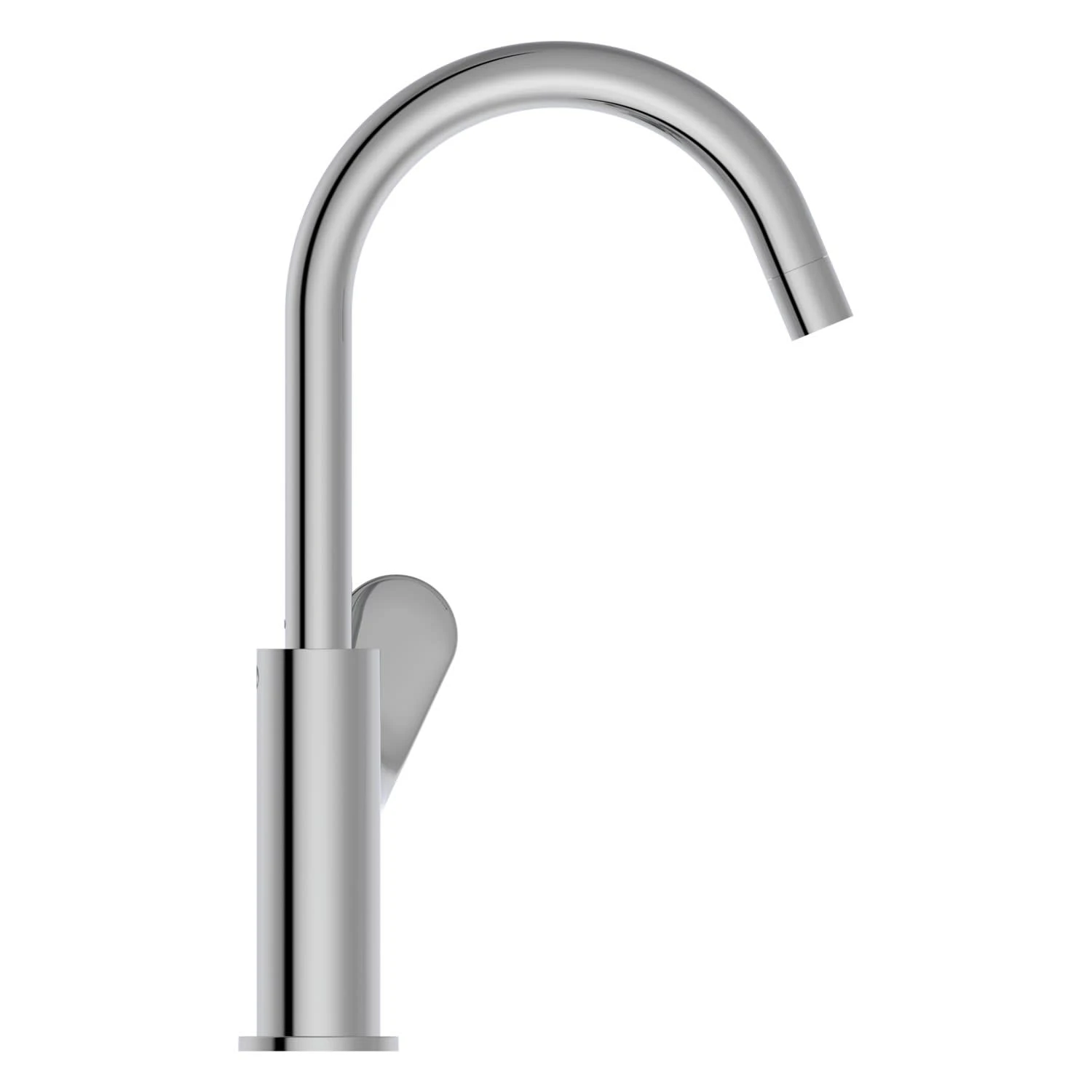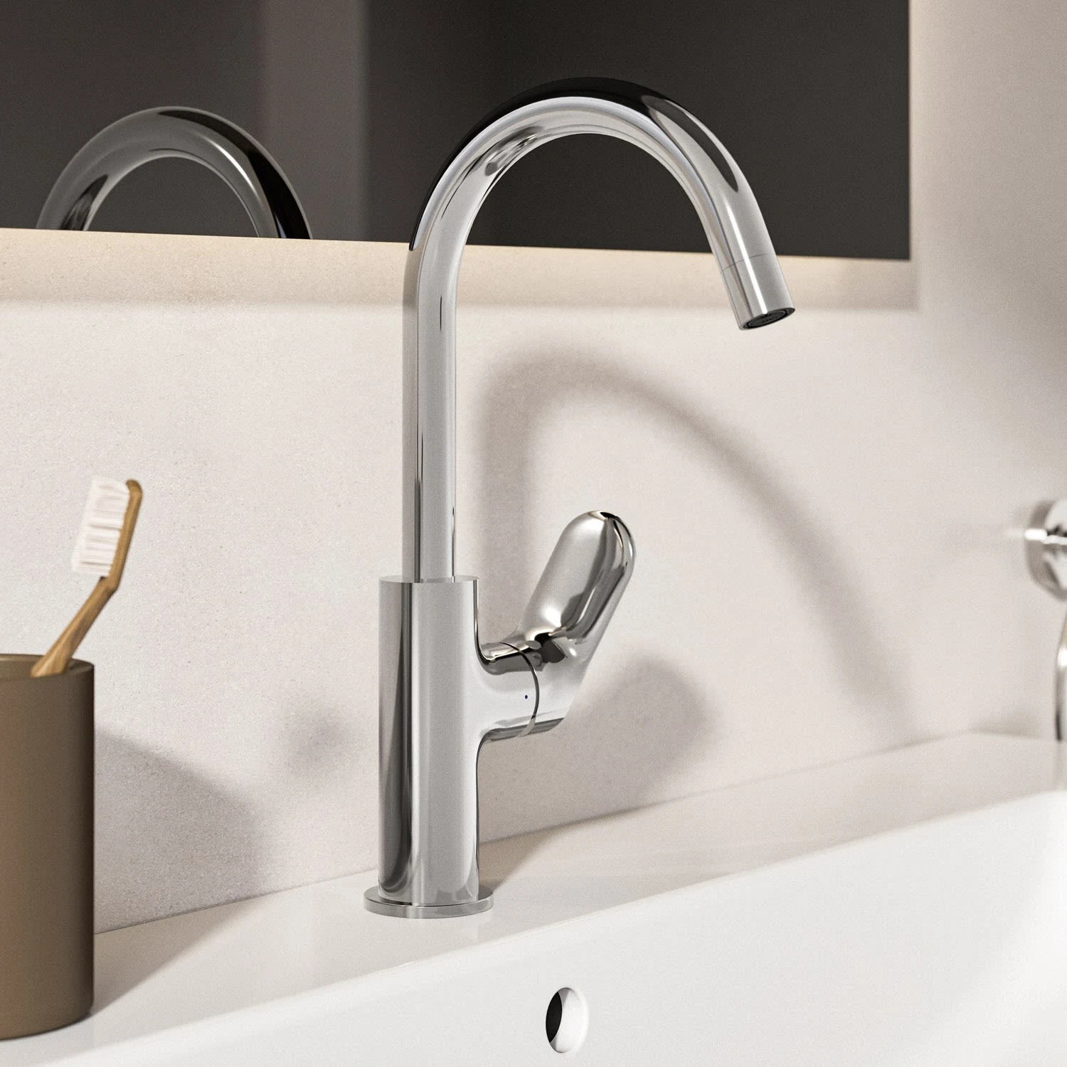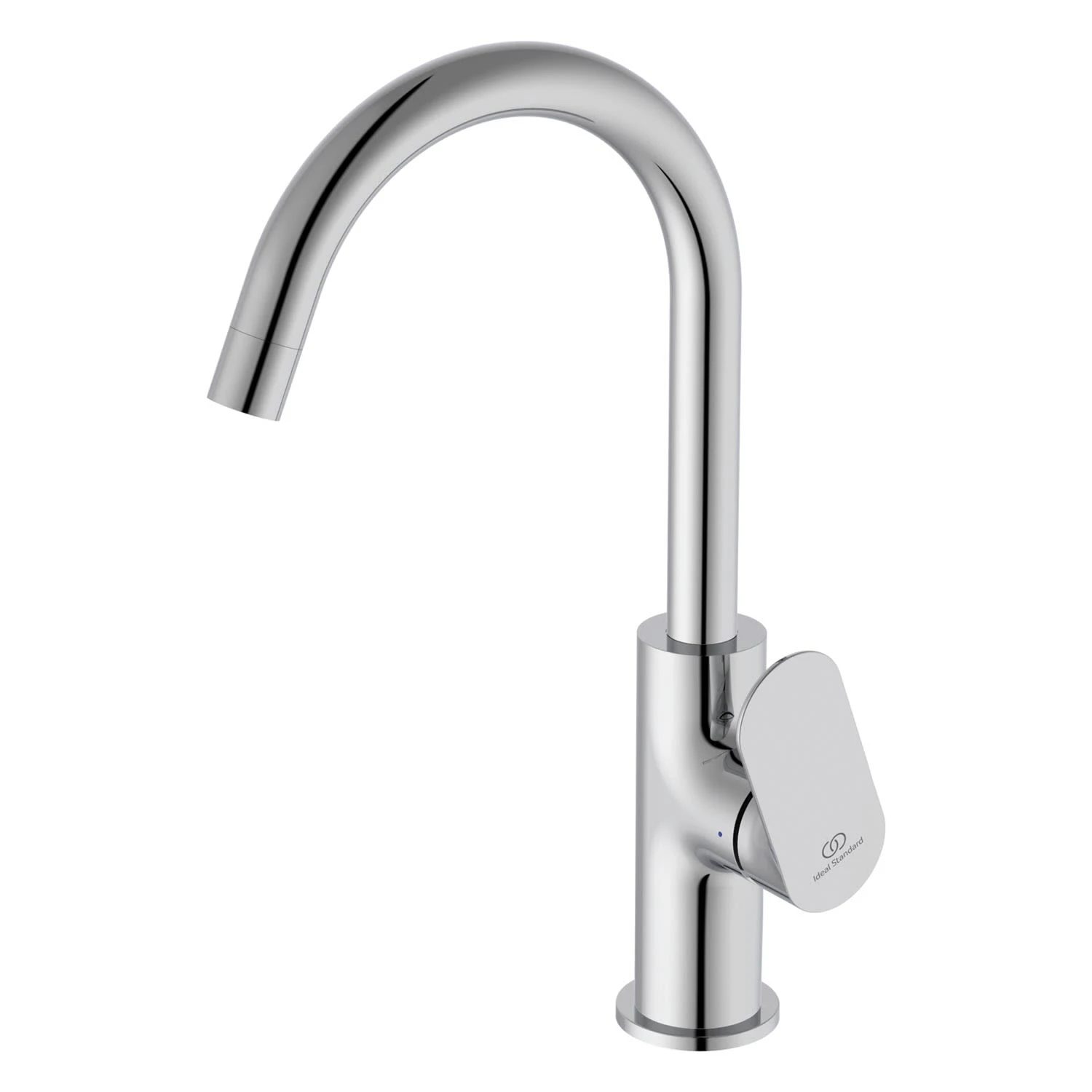 Ceralife O – Modernes Design trifft nachhaltige Funktionalität Die Ceralife O Waschtischarmatur von Ideal Standard vereint modernes Design mit nachhaltiger Funktionalität. Ihre fließenden, organischen Kurven sorgen für eine einzigartige Ästhetik, die jedem Badezimmer einen Hauch von Eleganz verleiht. Mit ihrer Auslaufhöhe von 21,5 cm und dem 360° Schwenkbereich bietet sie Ihnen maximale Flexibilität und ermöglicht es, bequem alle Bereiche des Waschbeckens zu erreichen. Dank des Easy-Fix Schnellmontagesystems lässt sich die Armatur besonders einfach installieren und sorgt für ein schnelles und stressfreies Montageerlebnis. Die Armatur ist mit einem hochwertigen Metall-Push-Open-Ventil ausgestattet, das den Wasserablauf reguliert. Die FirmaFlow®-Kartusche überzeugt durch ihre lange Lebensdauer und ihren hohen Komfort. Sie steuert die Wassertemperatur und den Durchfluss präzise und reduziert den Wasserverbrauch gleichzeitig auf effiziente 3,8 Liter pro Minute. So schont die Armatur die Umwelt und Ihren Geldbeutel, ohne dass Sie Kompromisse machen müssen. Eigenschaften: Version: H200 Auslaufhöhe: 21,5 cm Luftsprudler (sichtbar) Metall-Push-Open Ventil Flexible Anschlussschläuche G3/8 Griff aus Metall mit Rot-/Blau-Markierung Schnellmontagesystem Easy-Fix Kartusche: Ø 2,8 cm FirmaFlow® Kartusche mit keramischen Dichtscheiben Kartuschenschwenkbereich: 100° Heißwassertemperaturbegrenzer Schwenkbereich Auslauf: 360° Norm: DIN EN 248 Geräuschverhalten DIN 4109: Gruppe 1 Lebensdauer: DIN EN 817 Durchfluss bei 3 bar: 3,8 l/min