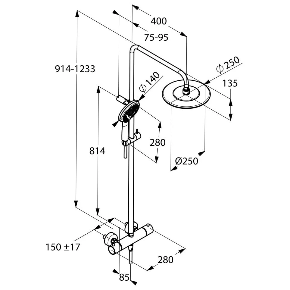 Eigenschaften: Wandmontage, mit horizontal und vertikal verstellbarem Rohr Höhe: 91,4 – 123,3 cm Temperaturwählgriff mit Heißwassersperre 38°C mit Keramik-Absperrventil als Drehventil 90°/90° Brauseabgang unten Handbrause Drehventil nach hinten Brauseabgang oben Kopfbrause Drehventil nach vorne eigensicher gegen Rückfließen mit Gleiter horizontal und vertikal verstellbar mit KLUDI SUPARAFLEX SILVER-Brauseschlauch G 1/2 x G 1/2 x 160 cm mit KLUDI Tellerkopfbrause Ø 25 cm mit KLUDI FRESHLINE Handbrause 3S mit Befestigungsmaterial