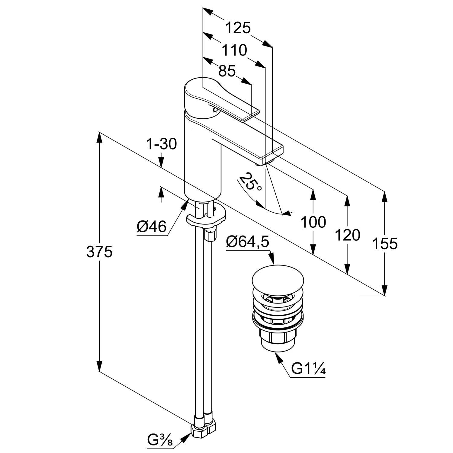 Eigenschaften: Waschtisch-Einhandmischer 100 DN 15 Einlochmontage geschlossener Hebel Keramik-Kartusche mit Heißwasserbegrenzung Strahlregler M 24 x 1 Durchflussmenge 5 l/min bei 3 bar PUSH-OPEN Ablaufgarnitur G 1 1/4 flexible Anschlüsse G 3/8 Schnell-Montagesystem Auslaufhöhe Unterkante 10 cm