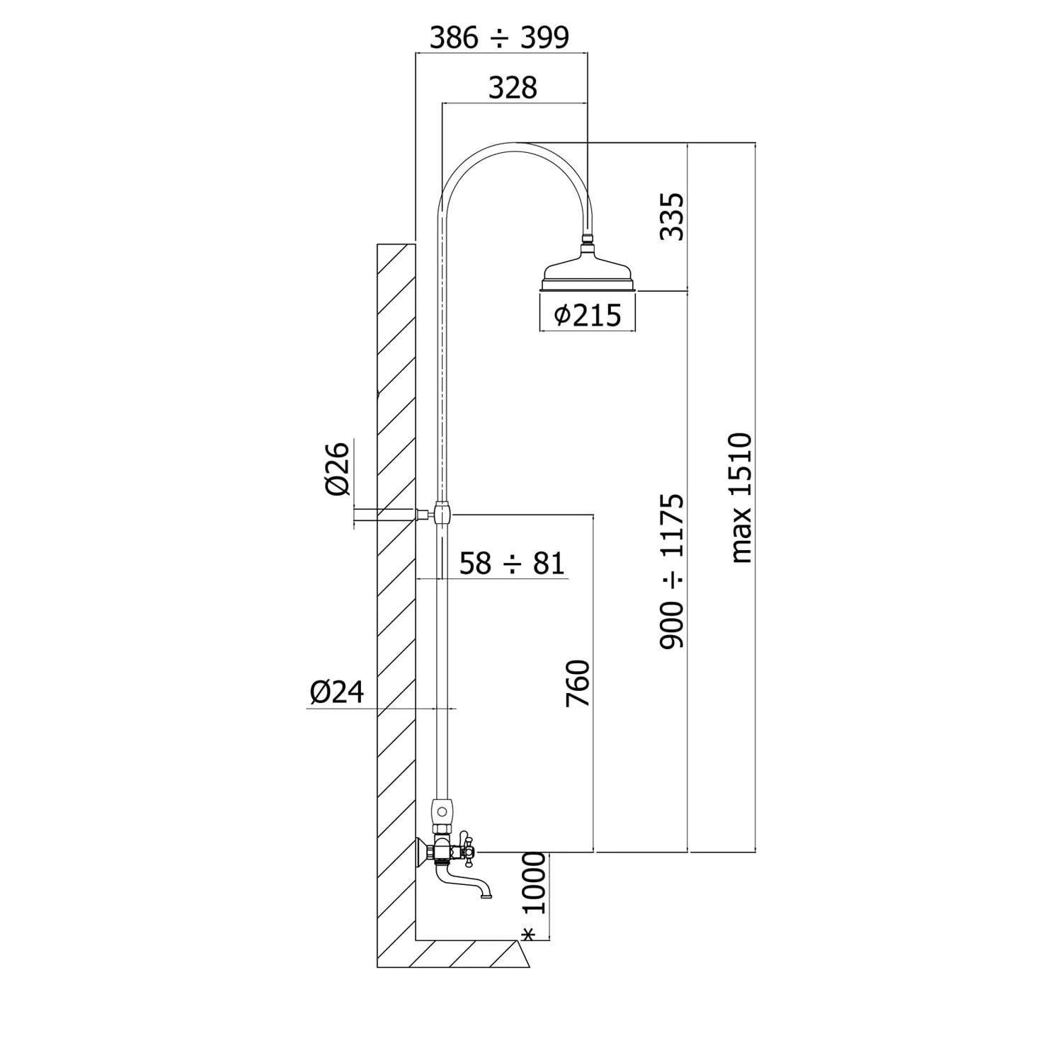 Eigenschaften: Ausladung Standbrause 33 cm Handbrause Retro (Einzelstrahl) Kopfbrause aus Metall Ø 21.5 cm Metall-Flexschlauch 150 cm mit Wannen-/Brausebatterie Das Steigrohr ist fertigungsbedingt nicht kürzbar