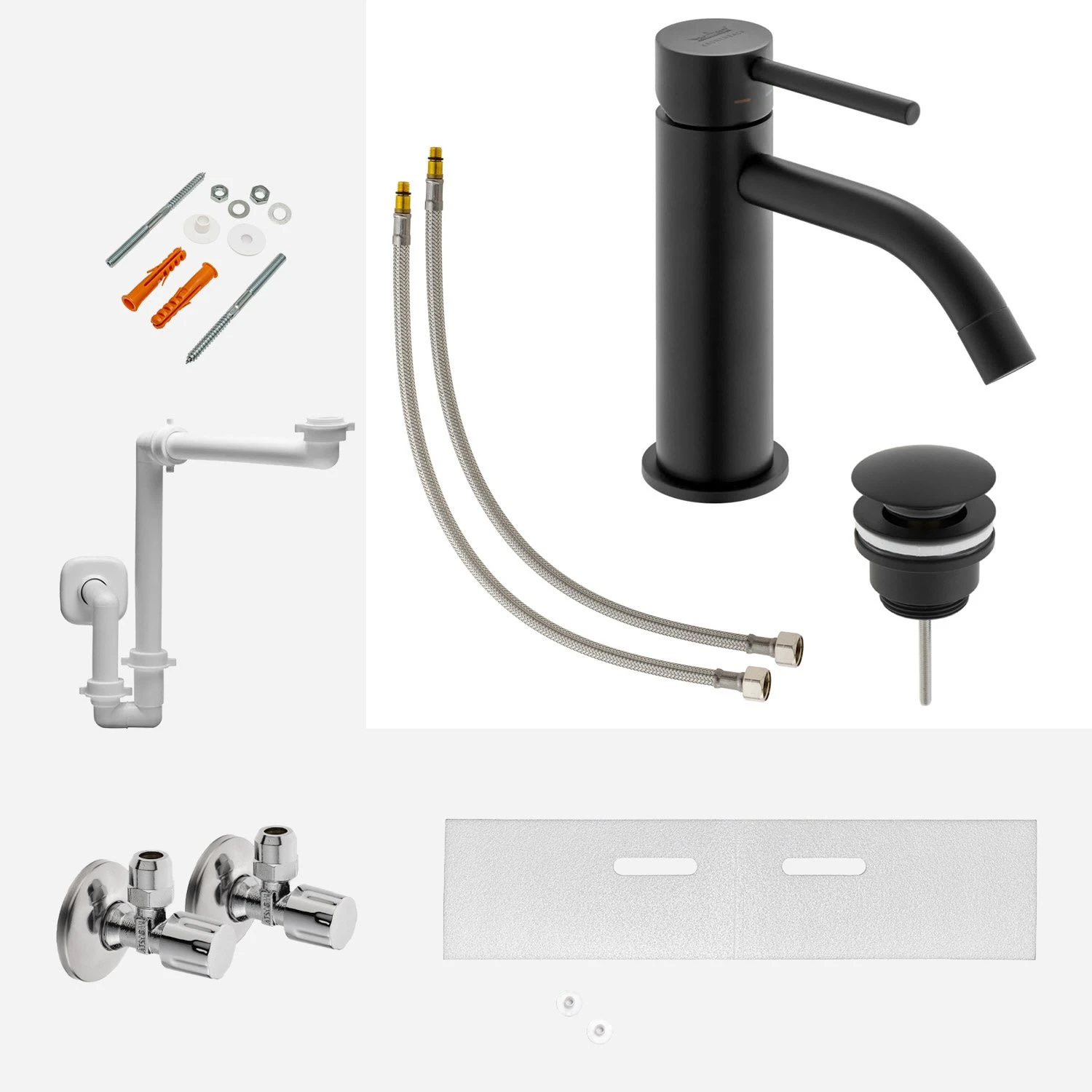 bestehend aus: 1x Kronenbach Lima 2.0 Waschtisch-Einhebelmischer, Art.: 100.1010SMKB 1x Kronenbach Pop Up Ablaufventil rund, kurz, Art.: 41.321.700.0001SM 2x Kronenbach Eckventil, Art.: 49170699KB 1x Kronenbach Waschtisch- und Möbel Raumsparsiphon 1 1/4″, Art.: 301904KB 1x Sturotec Waschtischbefestigungs-Set M10, Art.: STU6020603 1x Sturotec Schallschutz-Set 84 cm für Waschtisch, Art.: STU2655103 Kronenbach Lima 2.0 Waschtisch-Einhebelmischer: Luftsprudler M16 x 1 Keramikkartusche 2,5 cm flexible Edelstahl-Anschlussschläuche 3/8″ Kronenbach Pop Up Ablaufventil rund, kurz: Verstellbereich: 15 – 60 mm für Waschtisch mit Überlauf Material: Messing Anschluss: 1 1/4″ Kronenbach Eckventil: Farbe: chrom mit Längenausgleich und Schubrosette Selbstdichtendes Anschlussgewinde Prüfzeichen PA-IX692/IA Geräuschklasse I Ventil aus Messing gemäß Trinkwasserverordnung Dichtung mit KTW / W270, ohne Innenvernicklung mit PA / DVGW Zulassung Dimension: DN 15 G 1/2 AG x DN 10 G 3/8 AG zugfeste Messing Konus Quetschverschraubung 3/8″ ( Ø10mm ) mit Längenausgleich Kronenbach Waschtisch- und Möbel Raumsparsiphon 1 1/4: Kunststoff DN 32 / 1″ – 1 1/4″ inkl. Wandrosette Röhrengeruchsverschluss Sturotec Waschtischbefestigungs-Set M10: Waschtischbefestigung M10x140 mit Nylon-Dübel Sturotec Schallschutz-Set 84 cm für Waschtisch: Schalldämmplatte recyclingfähig aus geschlossenzelligem PE-Schaum zur Unterbrechung von Schallbrücken zwischen Wandfliesen und Keramikobjekten Stärke 4 mm