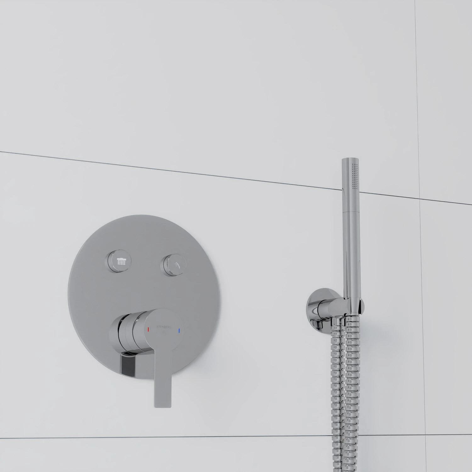 bestehend aus: Sensual Rain Unterputz-Einhebelmischer 3/4″ für 2 Verbraucher: Art. 390.2321 Rosette rund komplett mit Unterputzkörper mit pushtronic Bedienkomfort mit integrierter Wasserwaage mit Mengenregulierung 4 Buttons im Lieferumfang enthalten Durchflussmenge Kopfbrause: 22 L/min Durchflussmenge Handbrause: 22 L/min Serie 100 Brausearm für Wandmontage mit verstärkter Wandhalterung: Art. 100.7910 Ausladung: 40 cm Anschlussgewinde 1/2″ Serie 100 Regenbrause Ø 30 cm: Art. 100.1688 superflach: 0,8 cm Anschluss: 1/2″ Durchflussmenge: 15 L/min (bei 3 bar) Serie 100 Handbrausegarnitur mit integriertem Brauseanschlussbogen: Art. 100.1670 mit Stabhandbrause mit Metallbrauseschlauch 150 cm mit Wandhalter eigensicher gegen Rückfließen